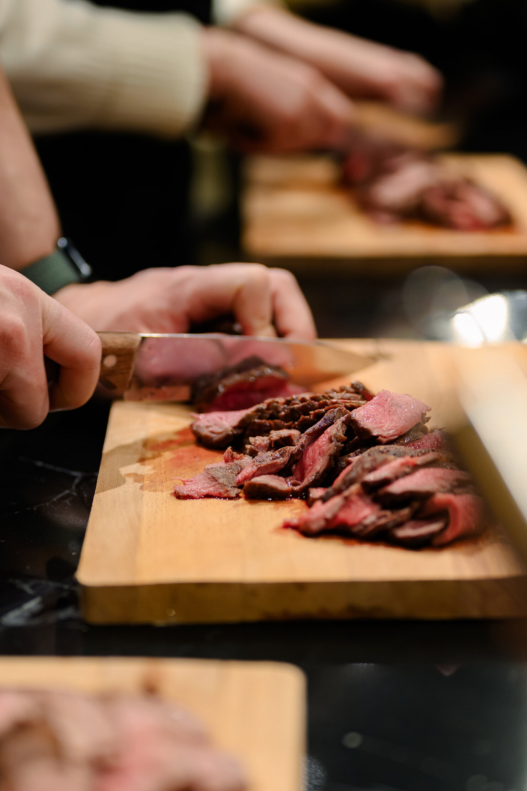 Во время мастер-класса вы готовите вместе с шеф-поваром и в процессе общения узнаёте важные нюансы работы с продуктами и техникой. Шеф делится не только секретами приготовления стейков, но и рассказывает, как правильно готовить говядину Веллингтон, работать с кухонным оборудованием, выстраивать вкус в салатах, пасте и других блюдах.